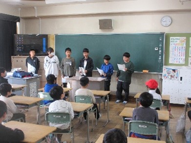 講演を聞いてまとめたことを、6年生が下級生に発表しました。